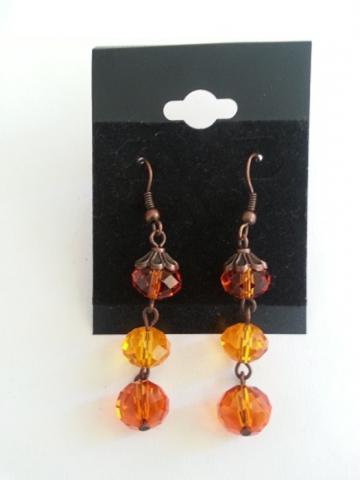 Rankų darbo auskarai. Ilgis: ~5,5 cm. Sudėtis - oranžinės ir geltonos spalvos stiklo kristalai, vario detalė