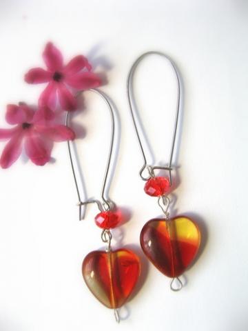 Rankų darbo auskarai su stiklo širdutėmis ir čekiskais kristalais