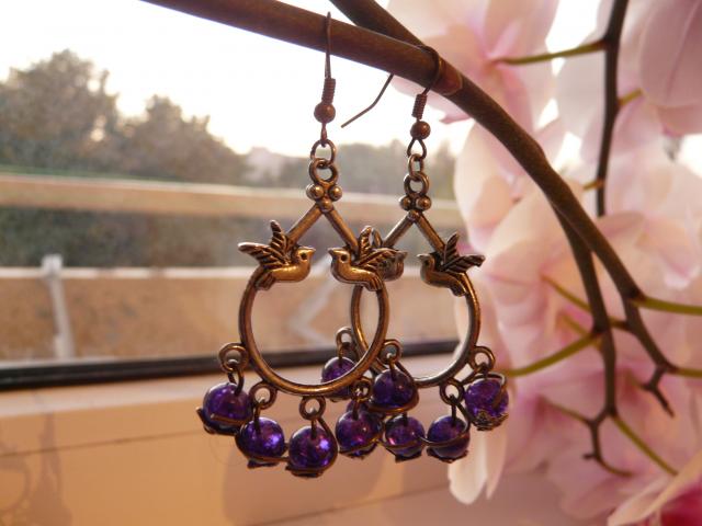 Auskarai su paukšteliais ir violetiniais karoliukais