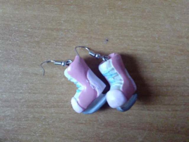 1. raudoni auskarai. 2. ranku darbo auskarai-bateliai.