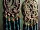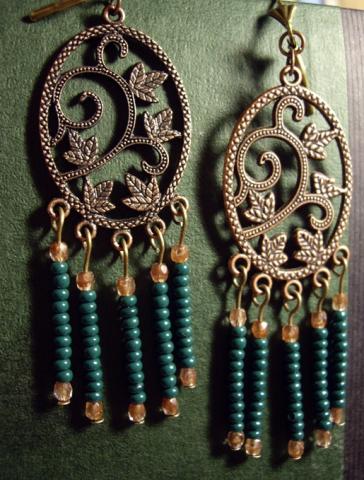 Auskarai su žalvario spalvos pagrindu ir jūros bangos spalvos karoliukais.