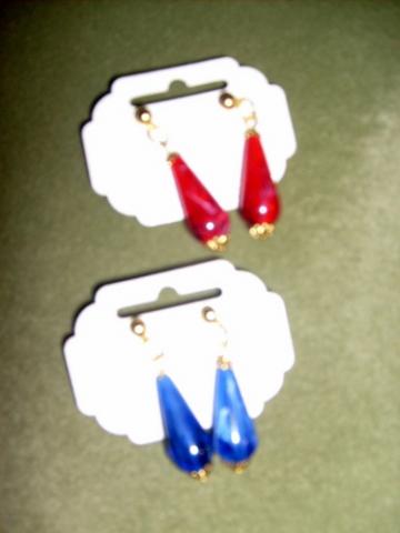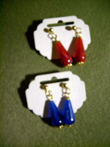 Raudonu ir melynu auskaru poros. Ne auksiniai, imituoja. Visiskai nenaudoti.