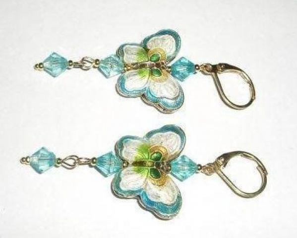 NAUJI, RANKŲ DARBO. Cloisonne drugelis, plastikiniai karoliukai, bižuterinio metalo detalės. Ilgis (be kabliukų) - ~4,5 cm.