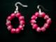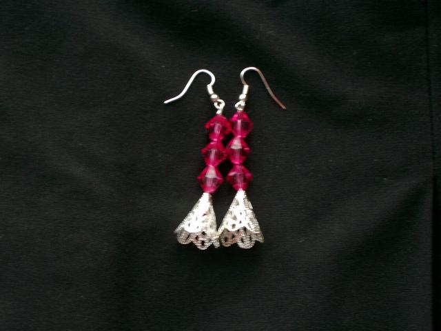 Rankų darbo auskarai su metalinėm gėlėm ir skaidriais rožiniais karoliukais.