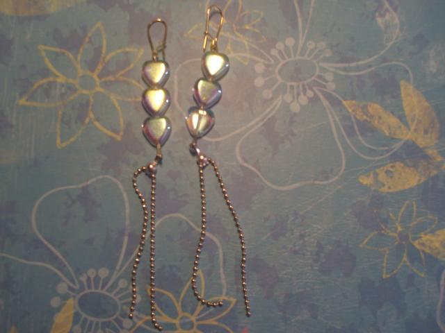 Labai ilgi auskarai su stiklinėmis širdutėmis.