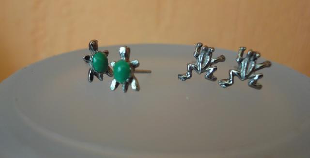 Mieli mažyčiai auskariukai - vėžliukai ir varlytės. Abejus atiduočiau už 6 Lt. Abi poros dalijasi vienu užsegimu :)) Tad geriau būtų, jei paimtumėte abi poras :) Gargždai, Klaipėda, Vilnius arba paštu :)