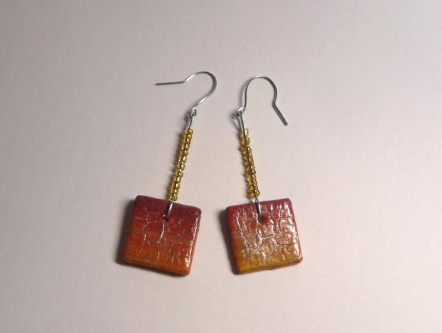 Rankų darbo auskarai, pagaminti dekupažo technika ant modelino pagrindo.