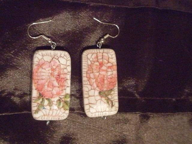 Rankų darbo auskarai su rožytėm, lengvi. Gali būti ir su sidabriniais kabliukais.