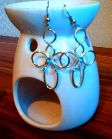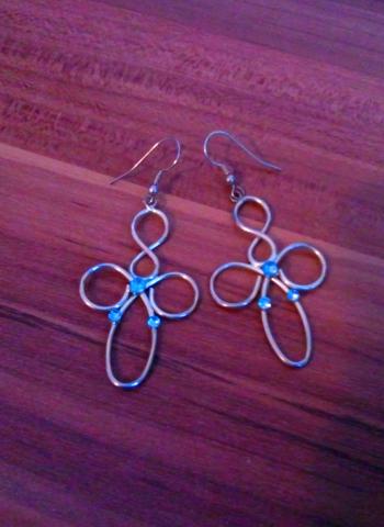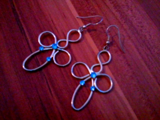 Auskarai, paprasto metalo, parvežti iš Amerikos, bet tokių nemėgstu. Ilgis nuo ausies 7cm. Žydros akutės.
