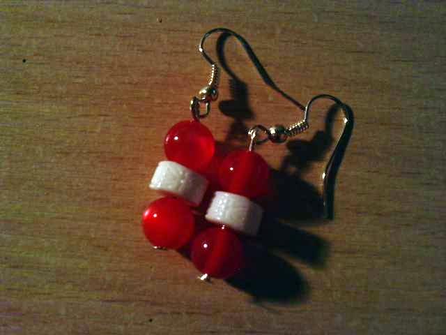 ranku darbo auskarai is raudonu ir baltu karoliuku. Taip pat darau uzsakymus kitokiems auskarams. Is ivairiu metalu- vario, aukso, sidabro.
