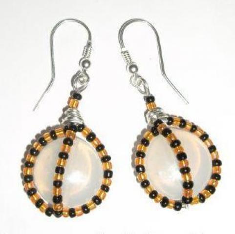 NAUJI, RANKŲ DARBO: plokščias stiklo karoliukas (18 mm), biseris, sidabruota vielutė, sidabriniai kabliukai. IIgis (be kabliukų) - ~ 3 cm.