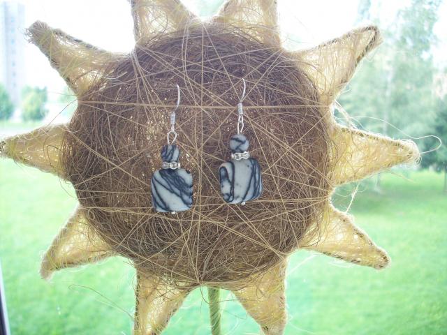 Kvadrato formos karoliukas su juodomis linijomis, viduryje panašus į žieduką su deimančiukais karoliukas ir tokio pat pavidalo trečias karoliukas kaip ir pirmasis tik, kad apvalus. Auskaro ilgis 4,1cm.