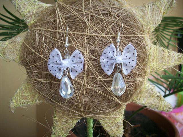 didelis baltas kristalas, baltas su juodais taškeliais kaspinėlis ir virš jo baltas mažytis kristaliukas. auskaro ilgis 5,2cm.