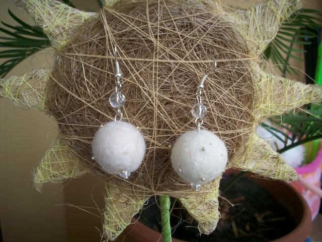 Baltos, gelsvos spalvos veltas kamuoliukas. Ant jo yra aukso ir sidabro spalvu rutuliukai. Virs veltinio yra kristaliukas apvalus, o po veltiniu mažytis kristaliukas.