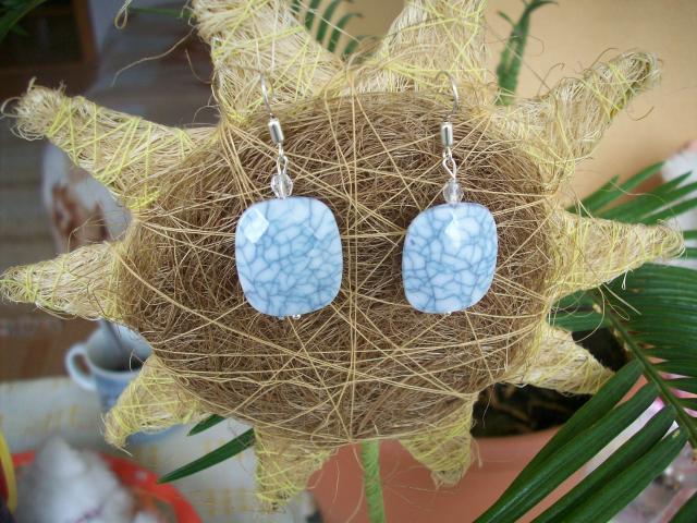 Auskarų ilgis 5 cm. Ar baltos ar Šviesiai, šviesiai mėlynos spalvos karoliukas su mėlynos spalvos Vingais. Virš jo yra mažas kristaliukas.