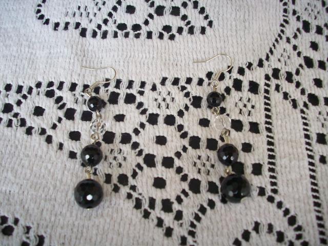 karoliukai nuo didžiausio iki mažiausio. Nuo apačios du pirmutiniai juodi kristaliukai, paskui baltas kristaliukas, o viršuje mažas juodas kristaliukas. Auskarų ilgis 6,5cm.