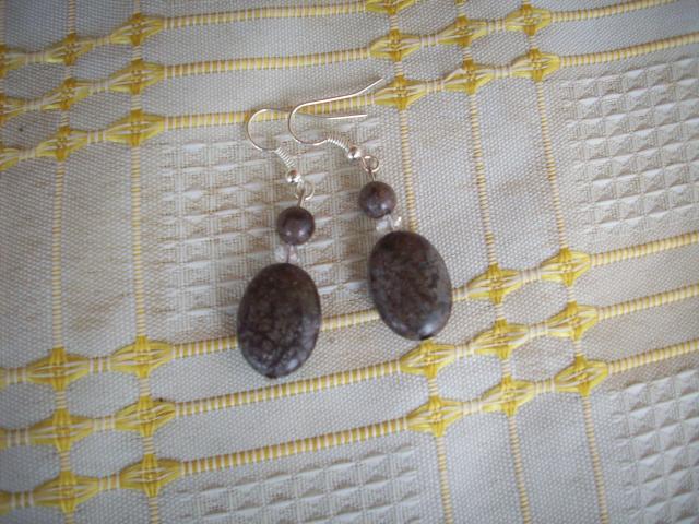 Akmenukas akmens spalvos, visuryje kristaliukas, o virš jo akmens spalvos karoliukas. Auskarų ilgis 5cm.