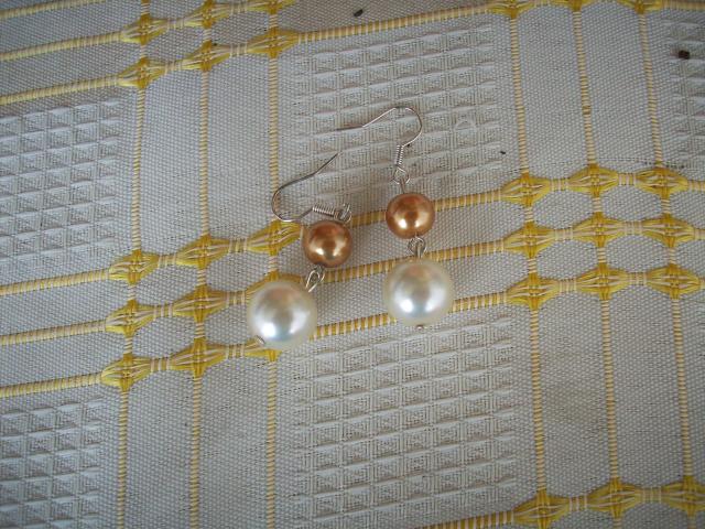 Apatinis karoliukas baltos, gelsvos spalvos. Antras aukso spalvos. Karoliukai suverti ant atskirų adatėlių. Auskarų ilgis 4,7cm.