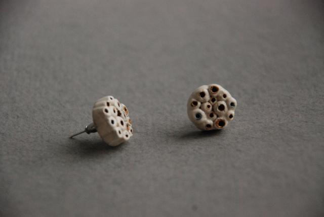 Rankų darbo auskarai su skylutėm. Baltas molis, auksinė, sidabrinė, bespalvė glazūros.