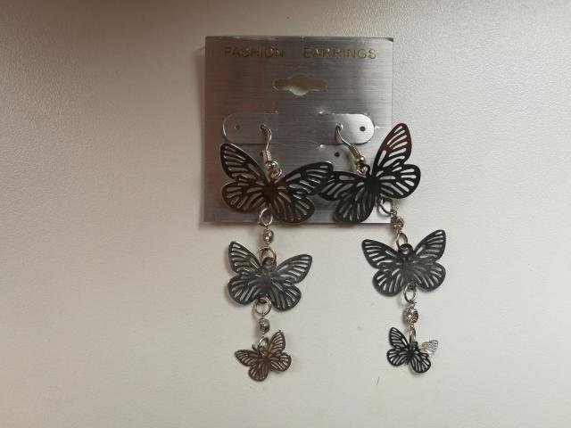 Nekiek nenešioti, sidabro spalvos, drugelių formos auskarai