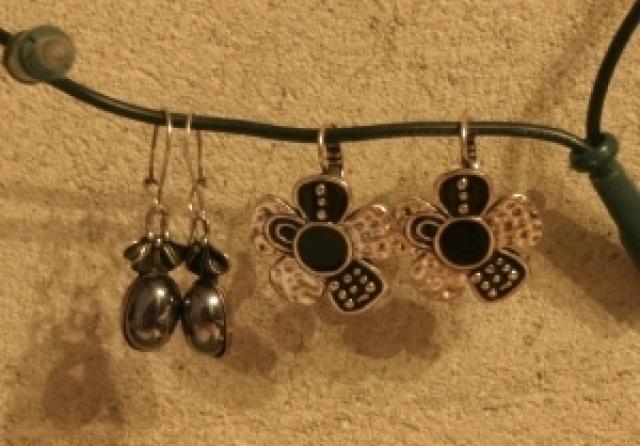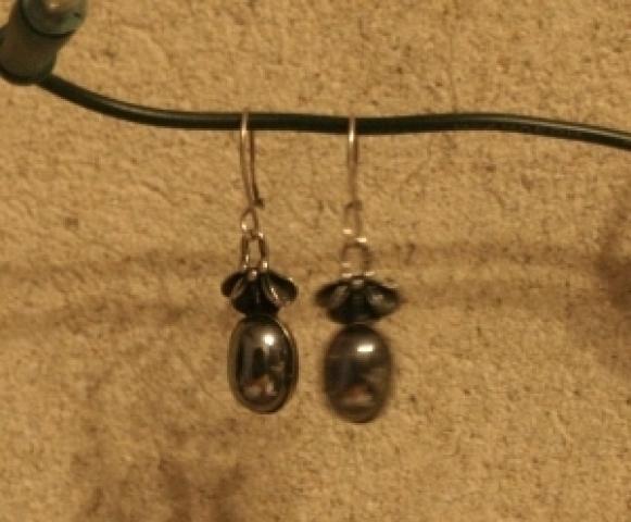 Kabantys sidabriniai su juodai pilksvu akmeniu, kurio pavadinimo nepamanu.