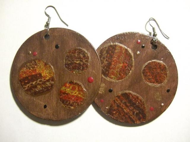 Dideli mediniai rudi auskarai su dekupažo detalėm.