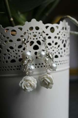 Rankų darbo auskarai su rožytėm ir perliukais. Sidabriniai užsegimai, yra praba 925. Bendras ilgis 6 cm