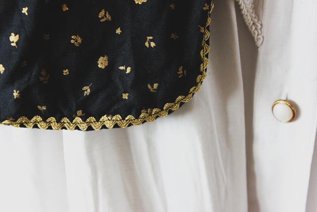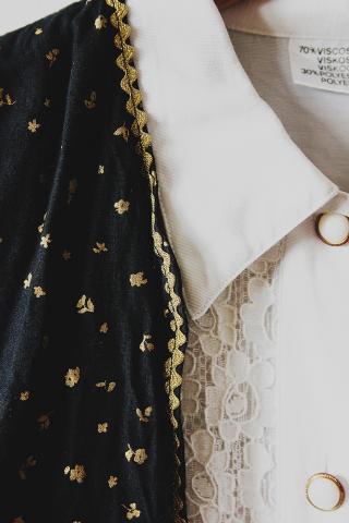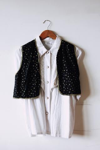 Nepriekaištingai apdirbtos detalės, gražūs, indiškus motyvus primenantys, raštai. Manau, jog geriausiai tiktų XS-M dydžiams. Pirkau vintažinių drabužių parduotuvėje, nėra jokių etiketės pėdsakų, manau, rankų darbo. Aukso spalva vaiski, neišblukusi.