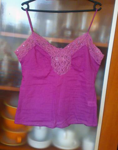 lengvos medžiagos maikutė, nėriniuose įsiuvinėti blizgūs žvyneliai, petnešėlių ilgis reguliuojasi. sudėtis - medvilnė. firma ,,Atmosphere''. 38 dydis