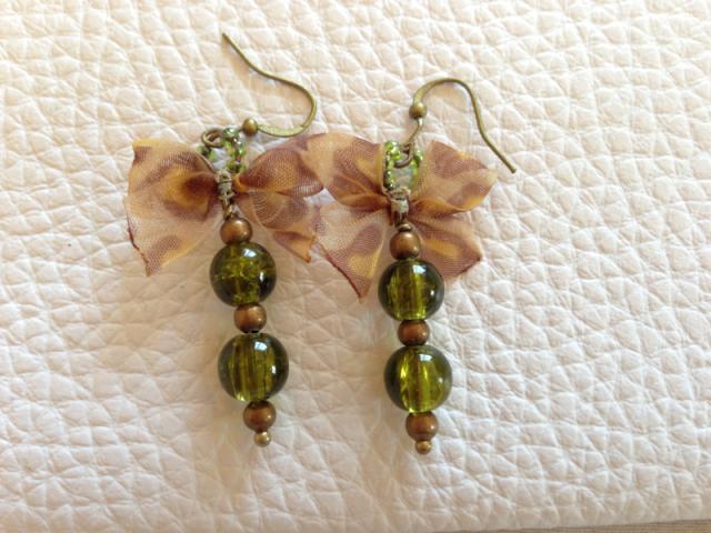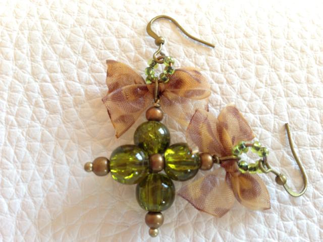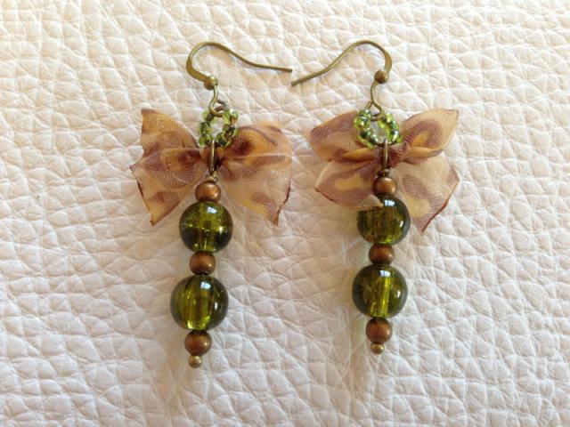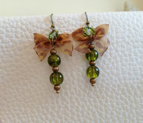NAUJI *leopardiniai kaspinėliai, samaniniai plastiko ir stiklo karoliukai, vario karoliukai; *ilgis: 52mm; Sudėtis: karoliukai: skaldytas akrilas 8mm diametras; karoliukai: varis 3mm diametras; karoliukai: stiklas 1,5mm diametras; kaspinas: organza; įsegimas ir kt.: vario lydinys