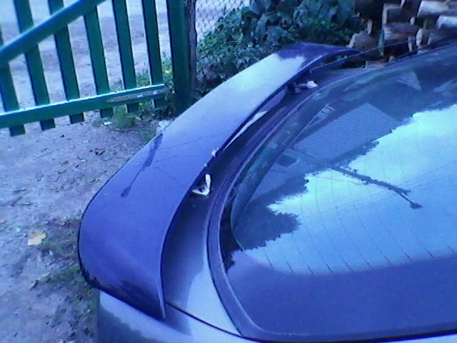 Geras spoileris, visi tvirtinimai sveiki. Melynos spalvos. Is tikruju bus zemesnis, nes dabar stovi ant tvirtinimo varztu, kurie turi isileist i bagazines dangti. Tinka daugeliui masinu: nissan, audi, bmw...