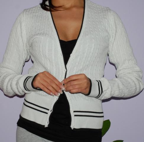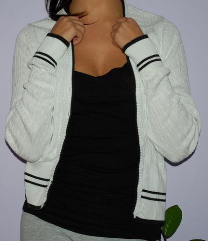 Labai dailus megztukas, baltas, puikios būklės. Tačiau vienas defektukas yra: iš nugaros prie pažasties prairimas, lengvai pataisomas nes labai nežymus. Dydį rašo xs siūlyčiau ir S nešiojančioms.