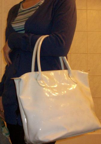 Balta lakuota ir tikrai talpi rankinė. Vidus ryškiai rožinis. Būklė nėra ideali, yra mažų dėmelių išorėje.