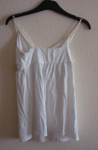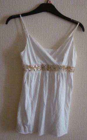 Balta palaidinė ant šleikučių, jokių etikečių nėra, tinka XXS ir XS dydžiams. Ilgis (be petnešėlių) 51 cm, krūtinės apimtis 36x2 cm (tempiasi iki 39x2 cm).