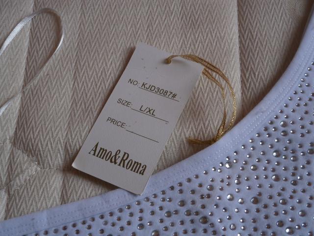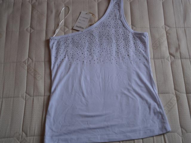 Balta palaidinė su papuošimais. Nauja. Pirkta Maltoje. Nenešiota. Vienas petys atviras. Nugaroje papuošimų nėra. Dydis M/L. 95 % medvilnė, 5 % elastanas.
