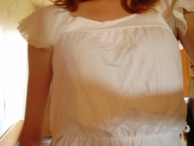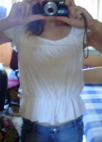 Balta, nepakeitusi spalvos, palaidinė. Iš esmės nenešiota (gal sykį užsivilkta). Puiki būklė, bet man netinka/nepatinka fasonas. Keičiu ir parduodu. Šone susiriša raištelis, o rankovėlės puoštos nerinukais.