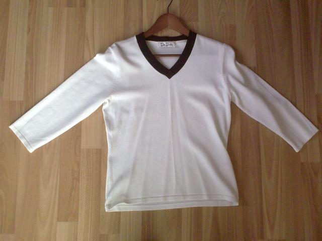 balta, kaklas nedideles V formos su juodu apvadu, rankose 3/4 . ant etiketes parasytas 38 dydis, bet dugiau sakyciau 36=38 .15lt, =siuntimo islaidos