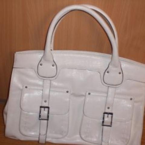 Balta rankinė, matmenys: 39,0 x 9,0 x 27,0 cm. Yra užsegimas per petį.
