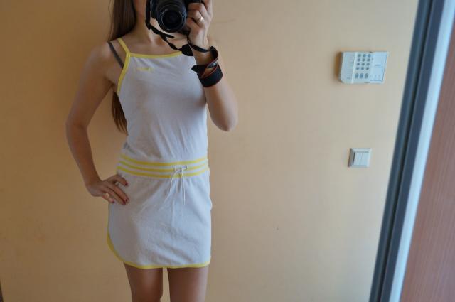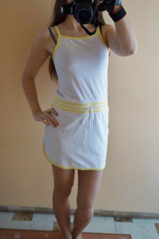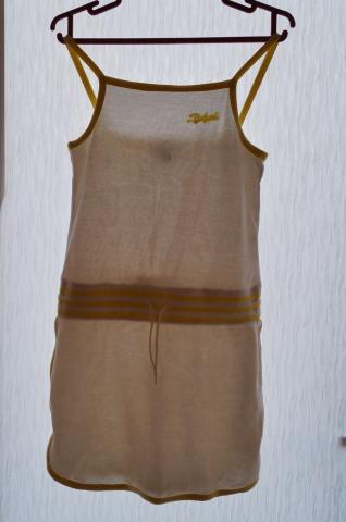 Suknelė paauglei, bet tiks ir XS-S dydžiui. Medžiagos pagrindas medvilnė, tekstūra minkšta, maloni, primenanti rankšluostį. Galima skalbti net ant 60 laipsnių. Išmatavimai: ilgis 80 cm; liemuo 38 cm x 2; tarp pažastų 37 cm; klubai 46 cm x 2.