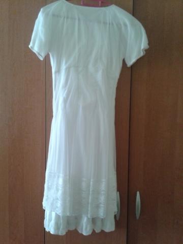 Suknelė, su natūralaus šilko pamušalu puošta tiuliu ir šilko kaspinu. Apimtis per liemenį 72cm, krutinės apimtis 86cm, ilgis 96cm