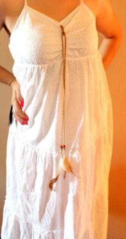 Visiškai nauja, ryškiai baltos spalvos suknutė su rudu pakabučiu - plunksna. Dydis parašytas M, tačiau puikia tinka tiek mažesniam, tiek didesniam dydžiui. :)
