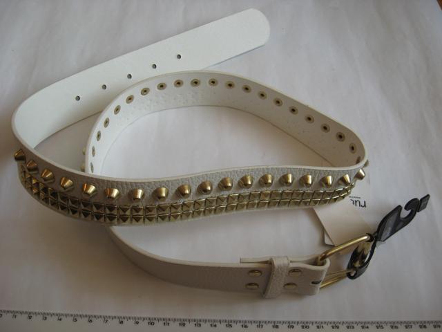Naujas (su etiketėm) "RUE 21" baltas diržas su geltono metalo kniedėm, ilgis 108 cm (papildomai prasibadžius skyles, tiktų nuo 80 cm)