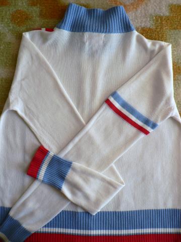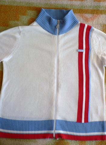 Baltas megztinukas su raudonomis ir mėlynomis juostomis. Gana plonas, šiek tiek peršviečiamas. Užsegamas užtrauktuku, aukštu kaklu. Be defektų.