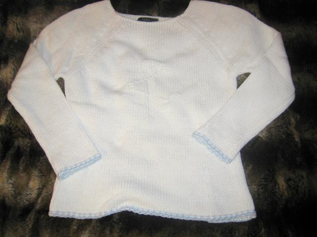 100proc medvilne, stambus mezgimas, vasarinis megztukas. Nenesiotas. Prekinis zenklas : tara Priekyje ismegztas piesinys - bure ar kazkas pan