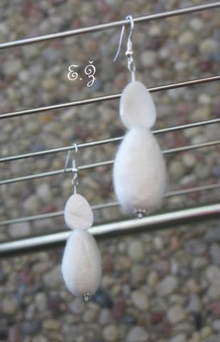 Rankų darbo auskarai, didesnis ovalas iš vilnos, viršuje perlamutras.