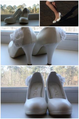 Vieną kartą dėvėti dailūs pateliai, nuotrauose matosi keleta smulkių įbrėžimų. Šonuose gražios rožytės.Patys bateliai pieno baltumo, o rožytės ir kulnas sniego baltumo.