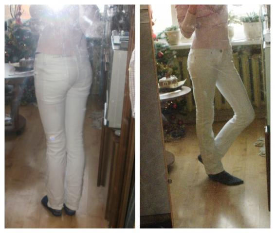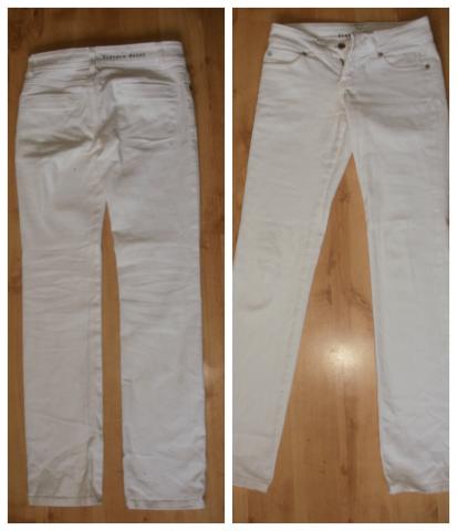 Balti džinsiukai be defektų, nedevėti, sudėtis: 98% medvilnė, 2 %elastano, kokybiški. Su kišenėmis, ilgis 103cm