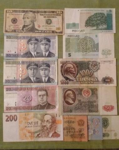 Įvairūs banknotai. 10 dolerių - 9 Eur. 10 litų - 6 Eur. Čekija - 6 Eur. 5 latai - 9 Eur. 1000 rublių - 7 Eur. 50 rublių - 3 Eur.