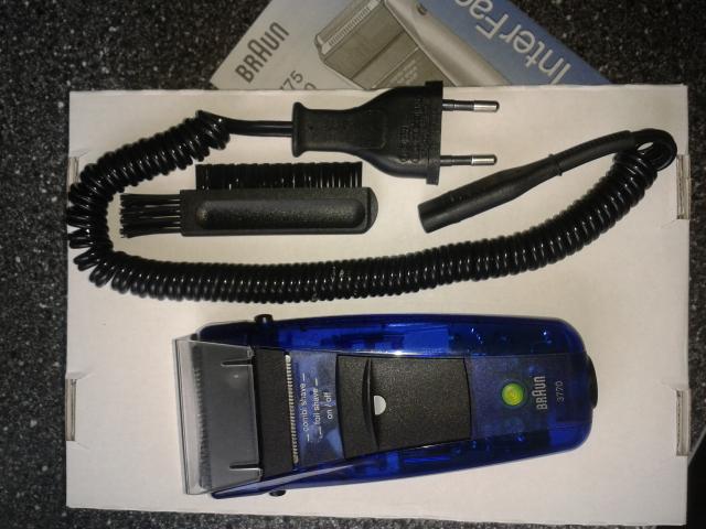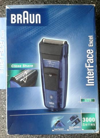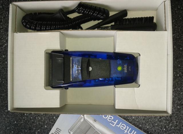 Barzdaskutė BRAUN 3770. Permatomu korpusu. Veikia iš tinklo arba nuo akumuliatoriaus. Naudota galbūt kelis kartus. Skutimo tinklelis nesulūžinėjęs.