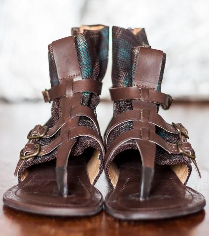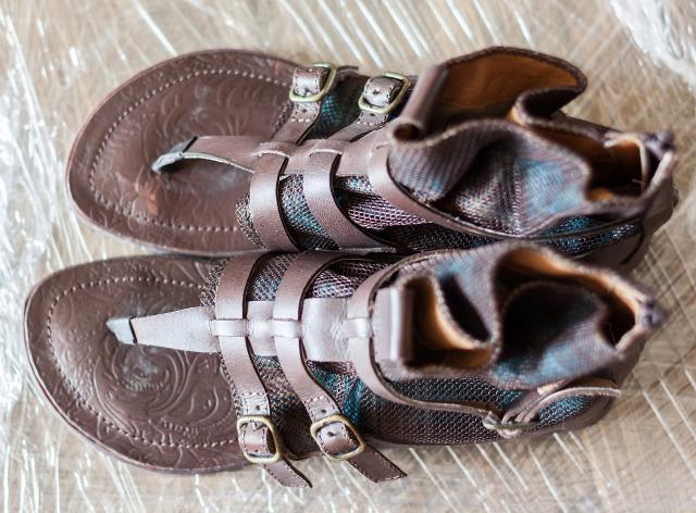 Parduodu, nes trina juostelė tarp pirštų. Iš principo nepernešu tokių basučių, tad galbūt čia tik man taip. Nešiau pas batsiuvį, kad paminkštintų tą juostelę, tai apklijavo minkšta oda, bet man vistiek nepatogu. Galėčiau duoti pabandymui dieną kitą, jei "nepriliptų" grąžinčiau pinigus (ir atsiimčiau basutę). Dėvėtos vieną kartą lauke, kelis kartus namie. Gamintojas neaiškus, yra išspaustas užrašas "ANDALO", bet internete tokio gamintojo neradau. Pirktos iš Membershop. Iš pažiūros odinės su medži